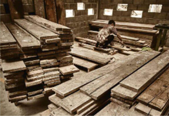 hardwoods from demolished factories, mills, boats, trucks, and furniture throughout southeast Asia.